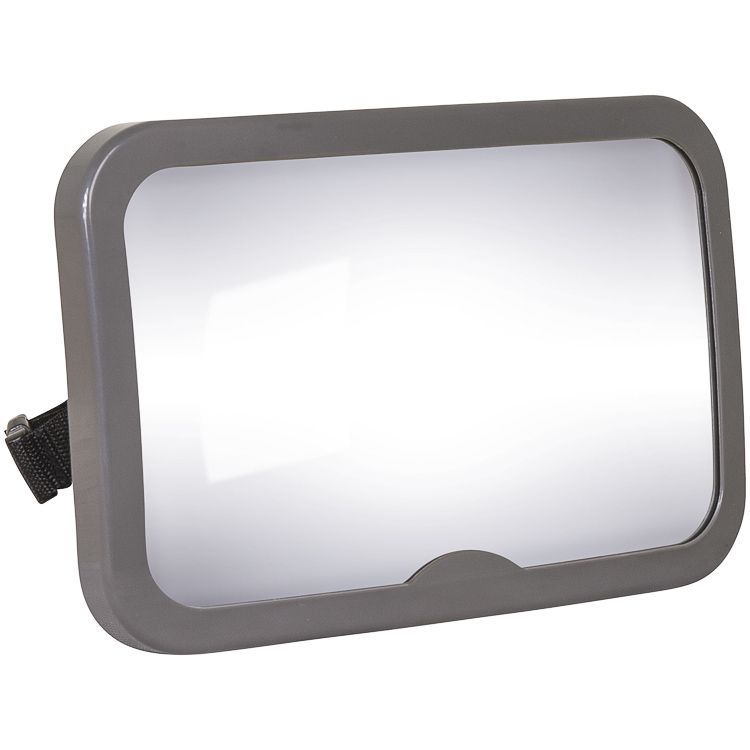 Espelho grande, de superfície plástica com regulagem de ângulo, super útil nos passeios com o bebê sentado no banco trazeiro do carro na posição de contra-fluxo.